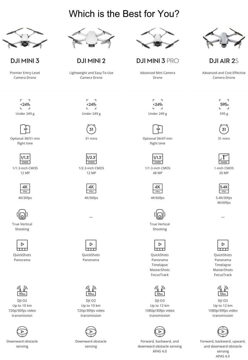 Compared with DJI Mini 2, DJI Mini 3 has comprehensively improved the imaging system, battery life, and other aspects: With a lightweight and compact body under 249 g, DJI Mini 3 features a 1/1.3-inch image sensor that supports dual native ISO and chip-level HDR technology and supports shooting 4K HDR video. The new gimbal design allows for True Vertical Shooting and large-angle tilt.