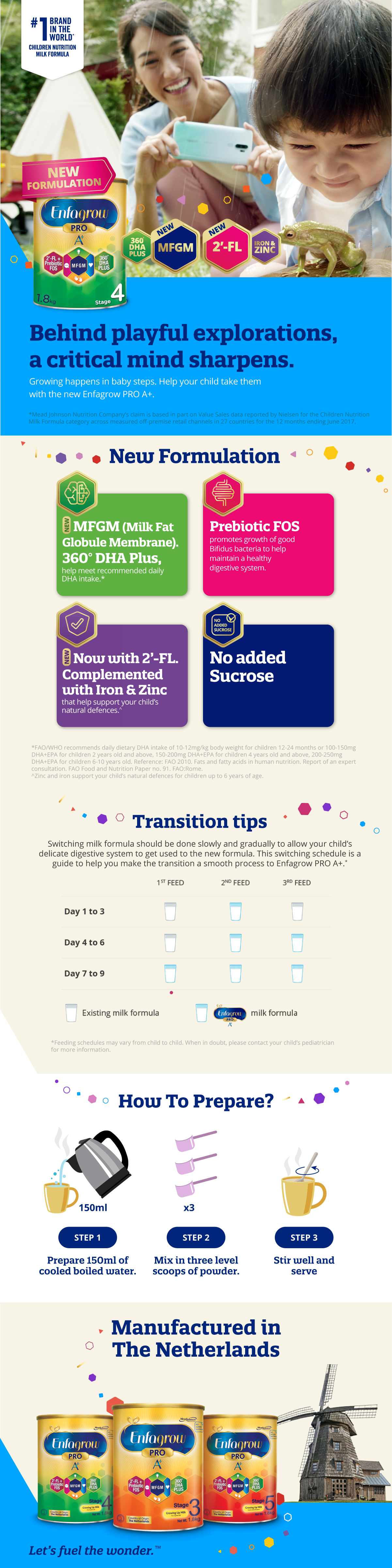 - With over 100 years of experience in pediatric nutrition, Mead Johnson Nutrition has scientifically formulated Enfagrow Pro A+ Stage 4 with a unique blend of nutrients that are important for overall mental and physical development.